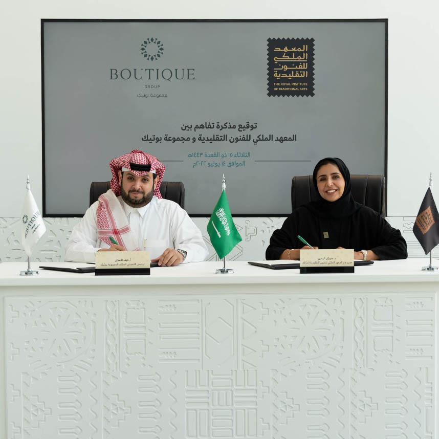 ووقع مذكرة التفاهم كل من المدير العام المكلف للمعهد الملكي للفنون التقليدية الدكتورة سوزان بنت محمد اليحيى والرئيس التنفيذي المكلف لمجموعة بوتيك الأستاذ نايف بن صالح الحمدان. حيث سيعمل الطرفان بموجبها على التعاون في إعادة تقديم التراث بروح عصرية بما يسهم في تنويع الفرص السياحية في السوق السعودي.