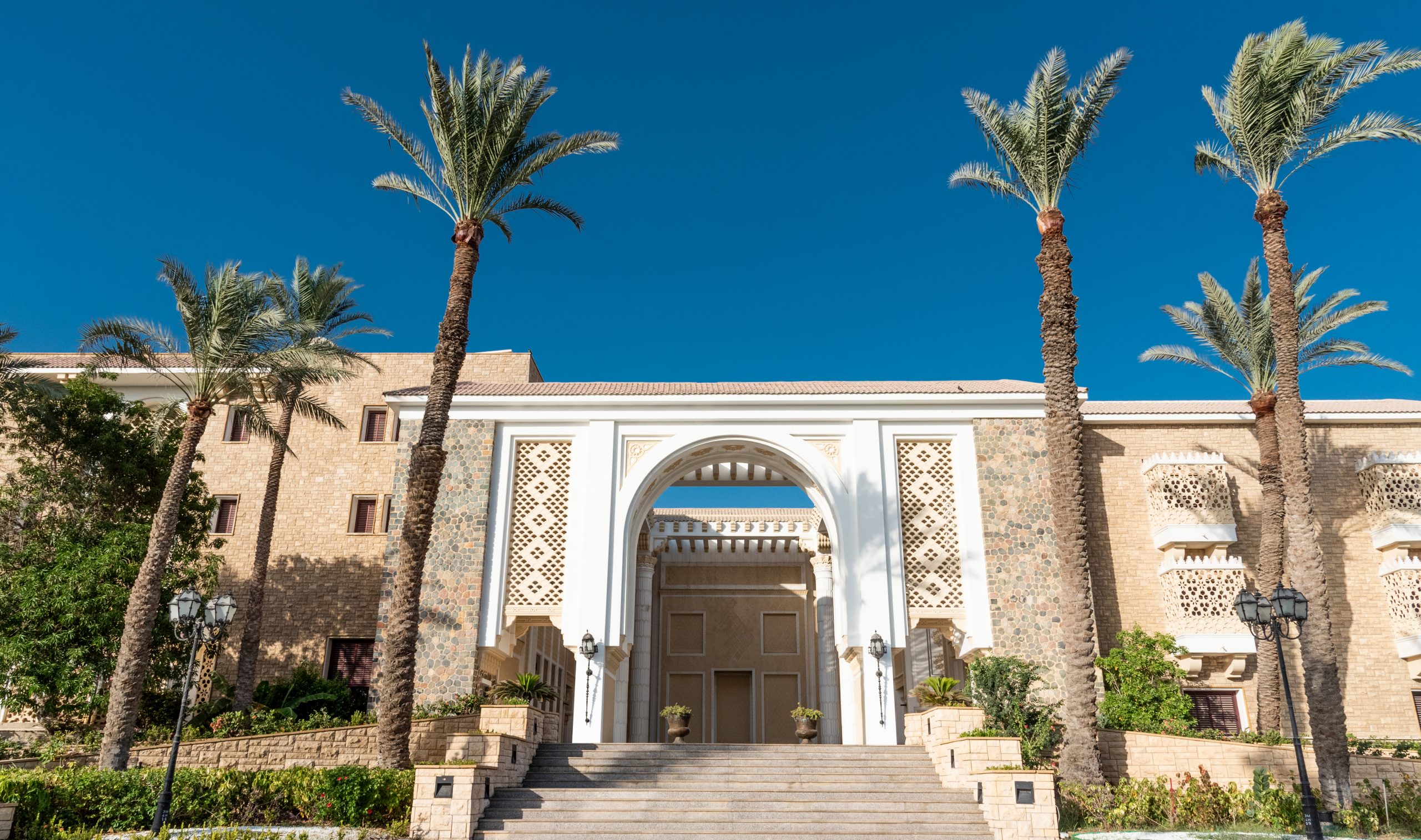 The palace pays eloquent tribute to traditional Arabic-Islamic architecture with richly adorned arched gateways, slanted roofs with aqua-green tiles, and a striking façade crafted from Riyadh stone.